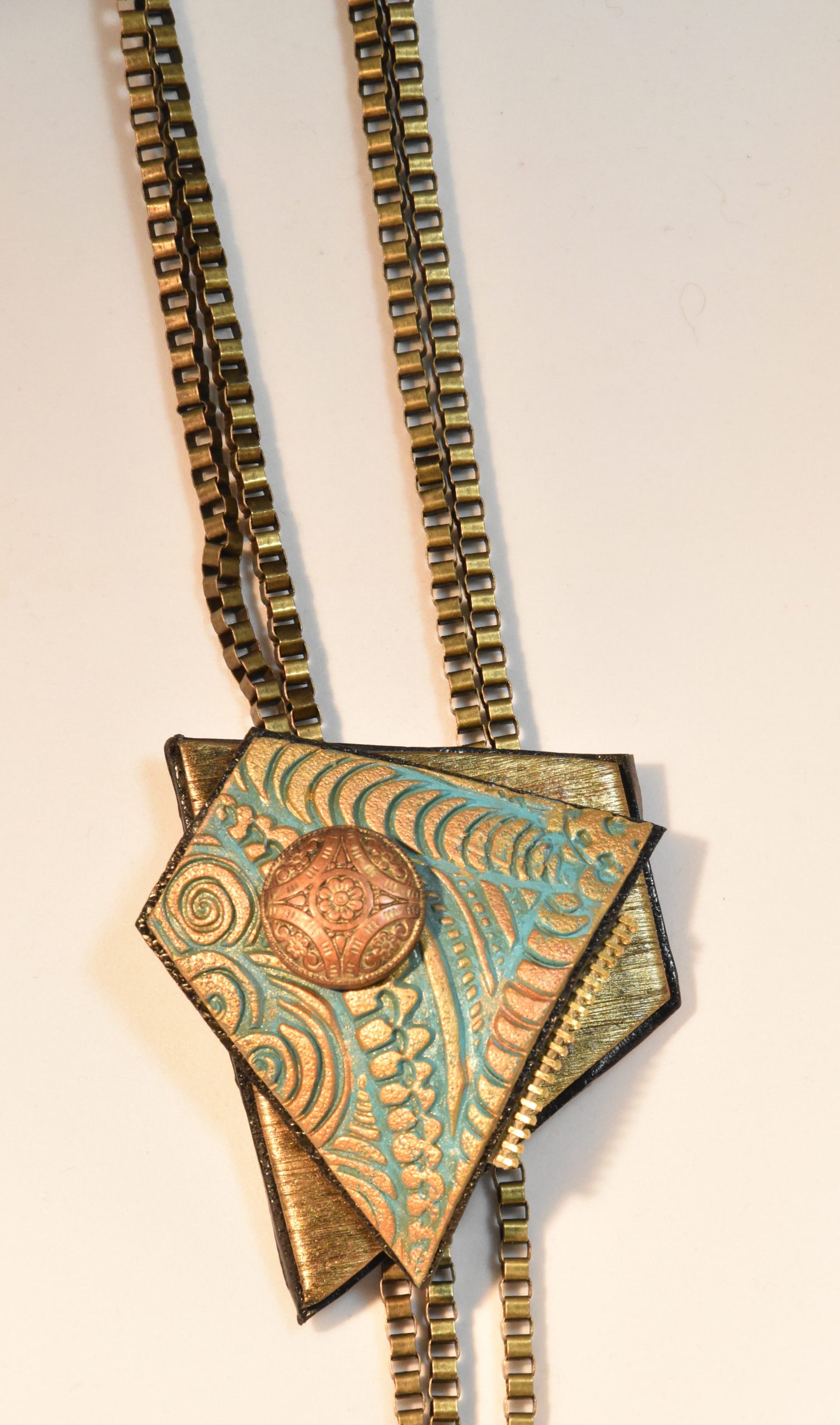 Turquoise and gold 2-layer pendant. Double antique brass chain. Gold button and zipper accents.